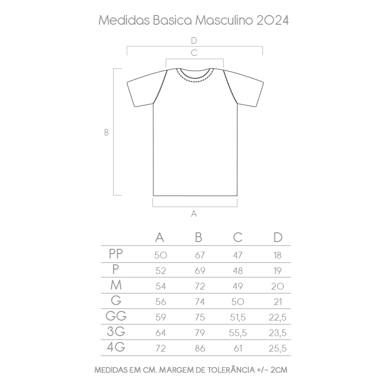 | Medidas Unissex | P | PP | M | G | GG | 3G | 4G |