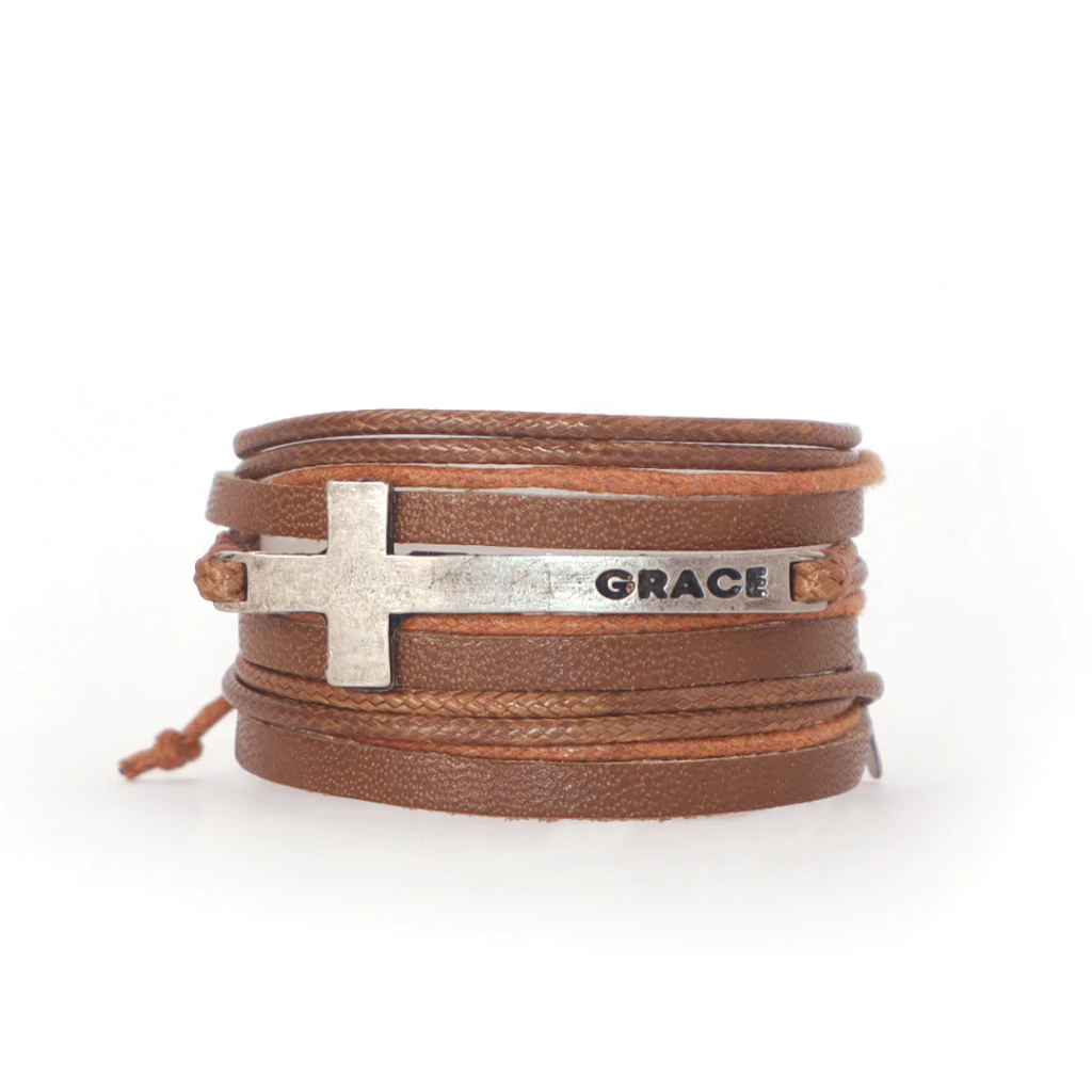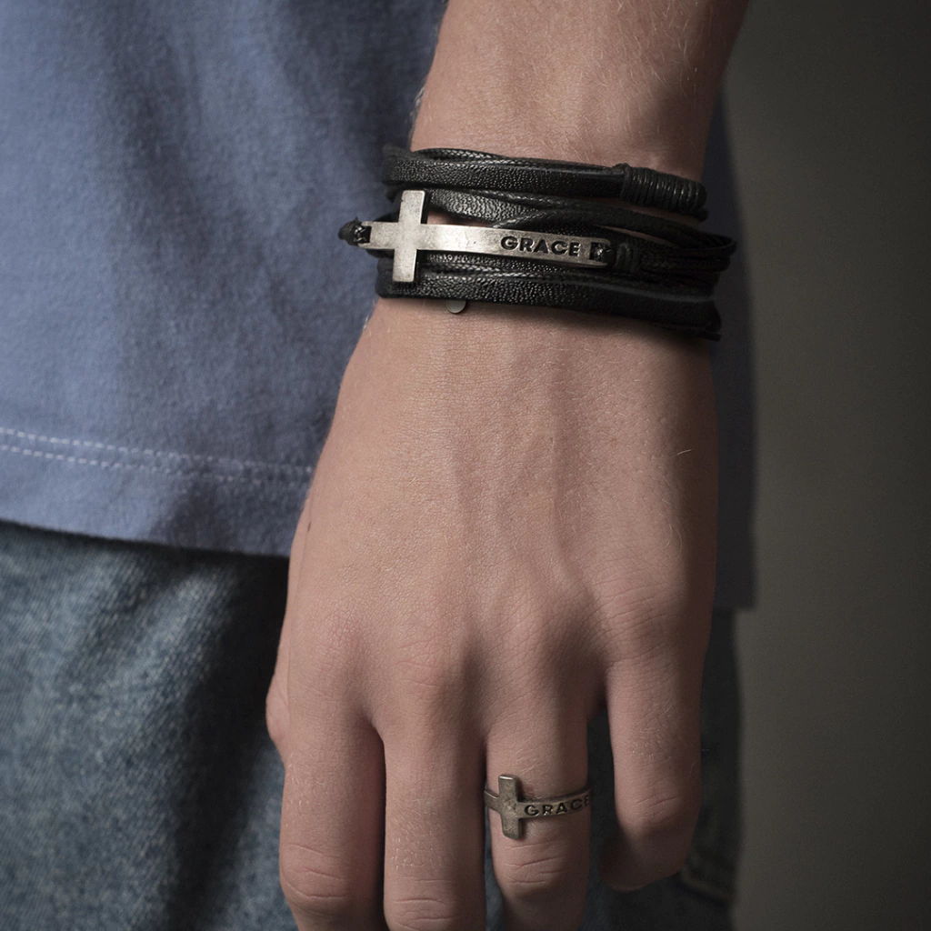 Nessa pulseira, a Cruz envolve o punho, como um abraço. Inscrito na lateral, a palavra GRACE (Graça), favor imerecido, que vem do Divino e que compartilhamos uns com os outros.